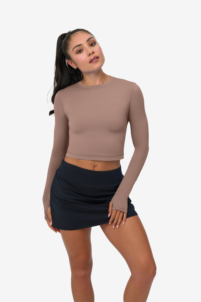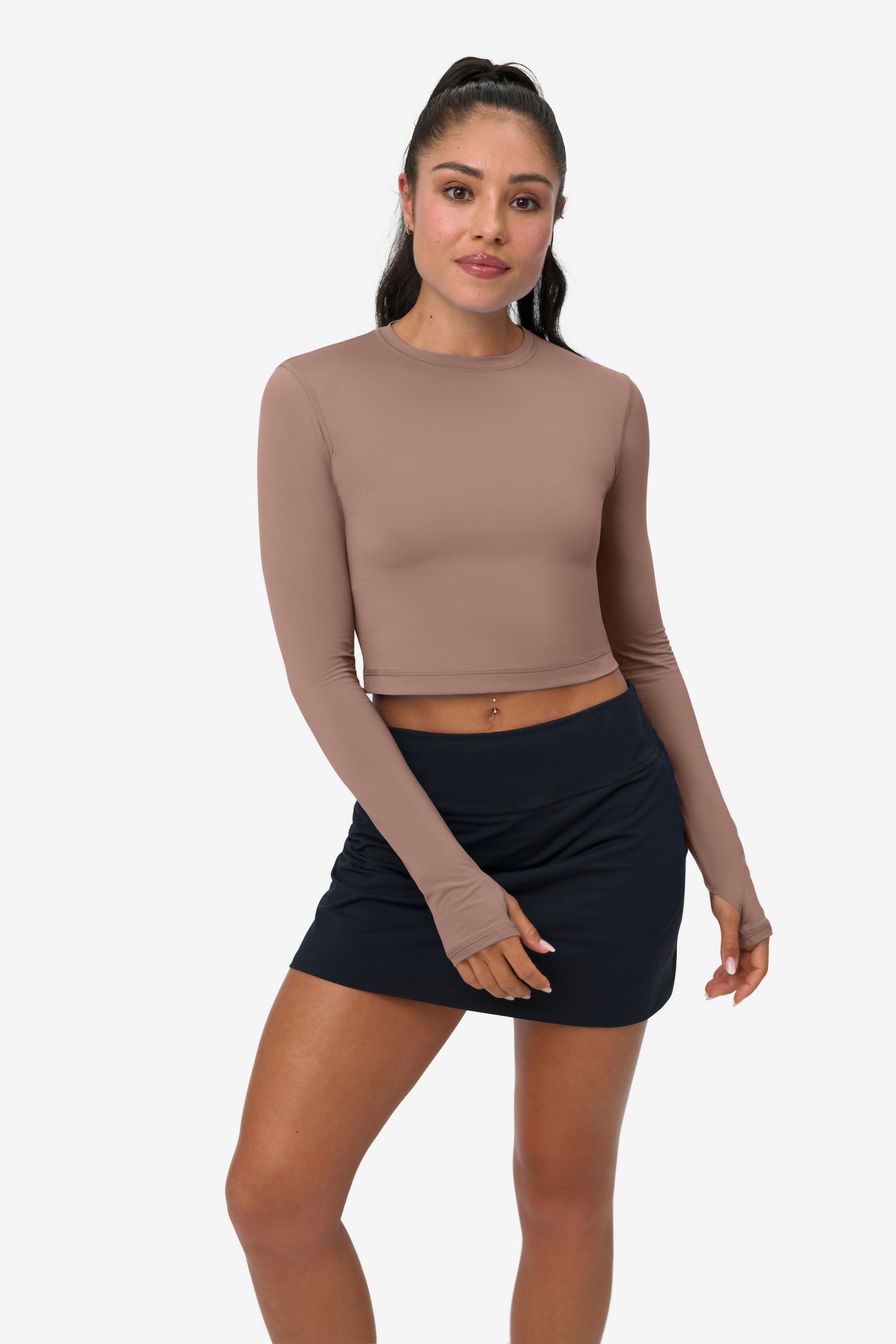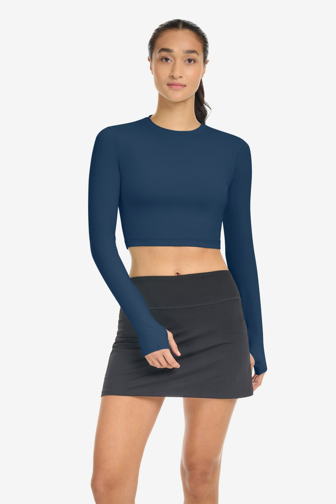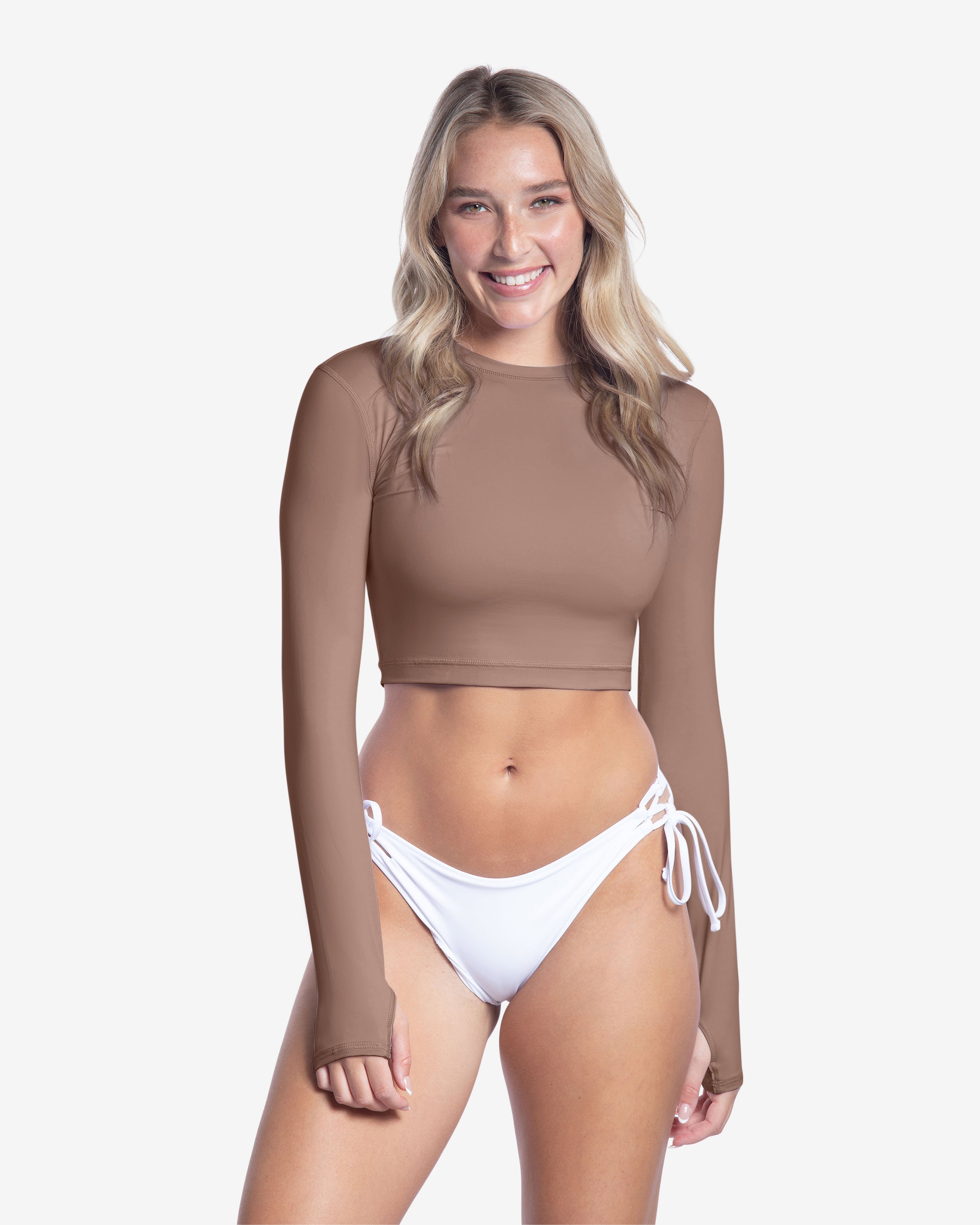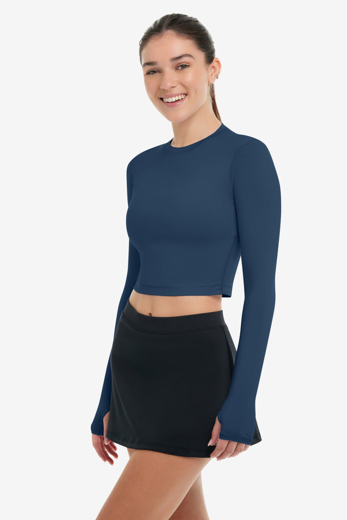 This is the perfect Everyday BloqUV UPF 50+ crop shirt when you want sun protection for your arms and shoulders without adding bulk. This extended body length everyday crop top was designed with a longer length to be worn over your favorite tank or swimsuit and with tights to provide superior SPF sun protection while keeping cool. It's suitable for activities on and off the water: running, biking, swimming, paddle boarding, yoga, tennis, beach tennis, pickle ball, sight-seeing, or just to protect you arms while driving! This extended-length crop top provides ample chest coverage when engaged in beach volleyball and racquet sports, ensuring it stays in place and avoids exposing your chest while serving or making slam shots..