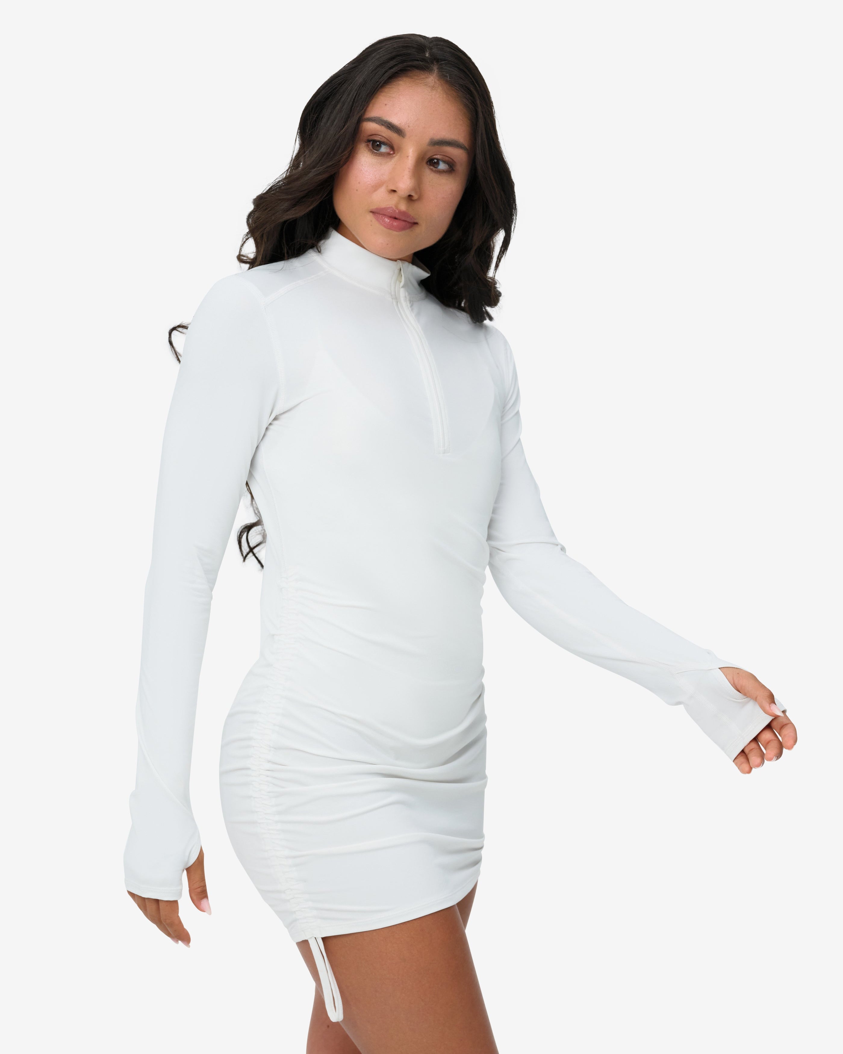 Adjust the side drawstrings to wear it as a dress, tunic, or long swim shirt, depending on your activity. With a high zippered neckline for added neck protection, elongated sleeves for hand coverage, and a true fit that moves with you, it transitions effortlessly from water to town. Pair it with BloqUV tights for a sophisticated, sun-safe look.