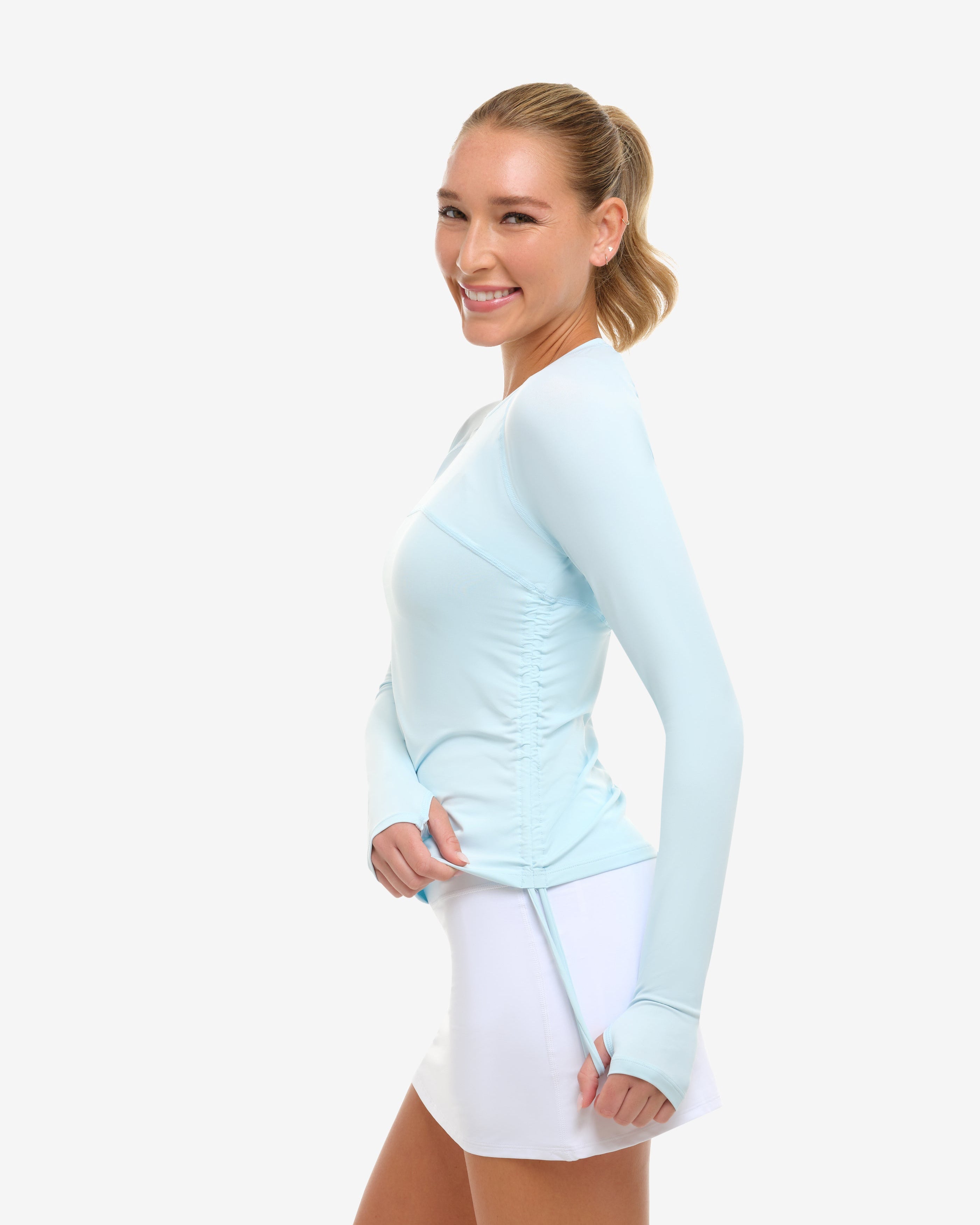 A staple piece to have as part of your athleisure wardrobe. This crew long sleeve UPF Shirt has drawstring for adjustable length. The side ruching allows you to wear the shirt as long or as short as you like. This indispensable, multi-functional piece looks great with joggers, pants or BloqUV tights and can also serve as a swim shirt or rash guard. Enjoy SPF protection while playing tennis, pickle ball, paddle boarding, boating, running, swimming, walking or shopping.