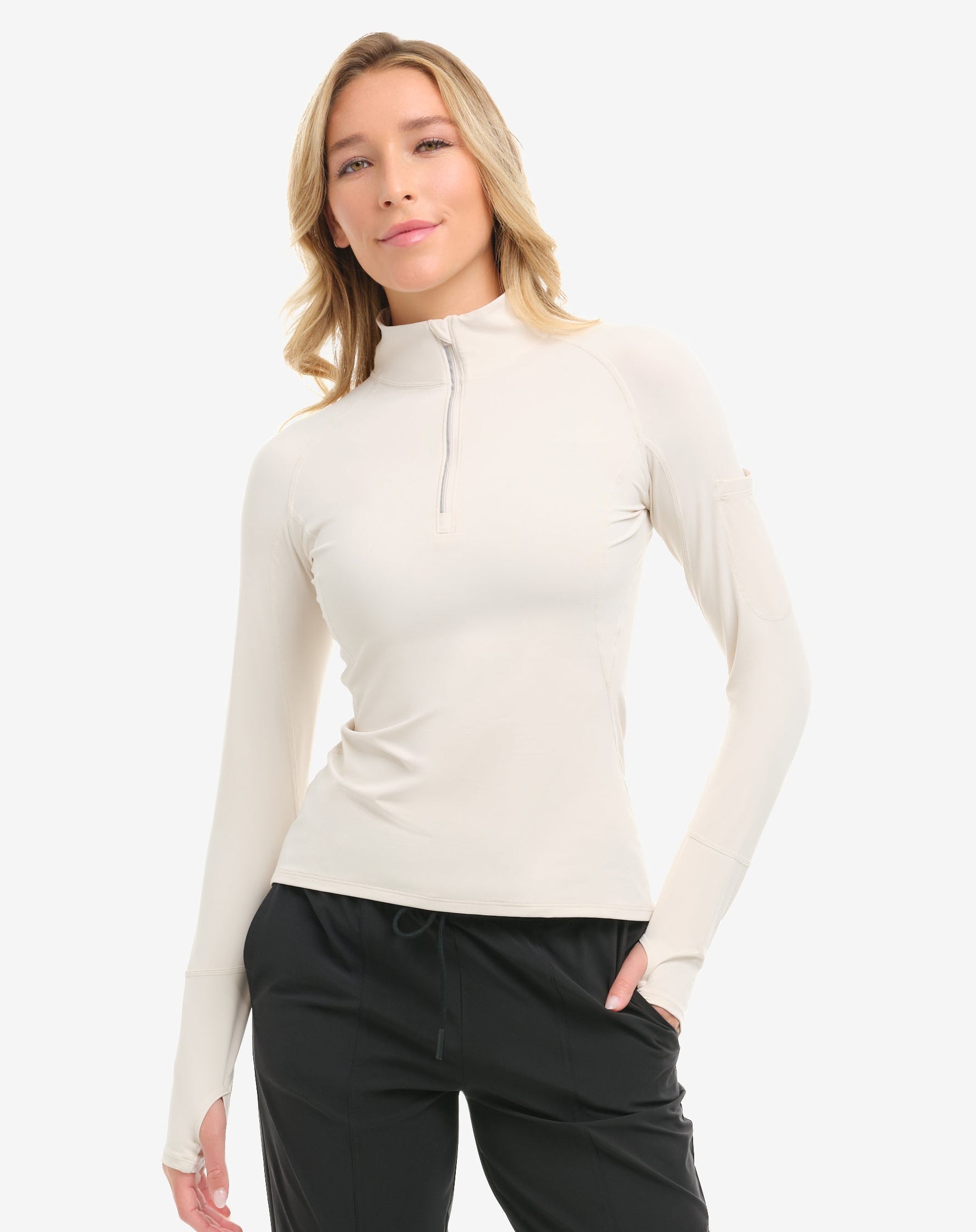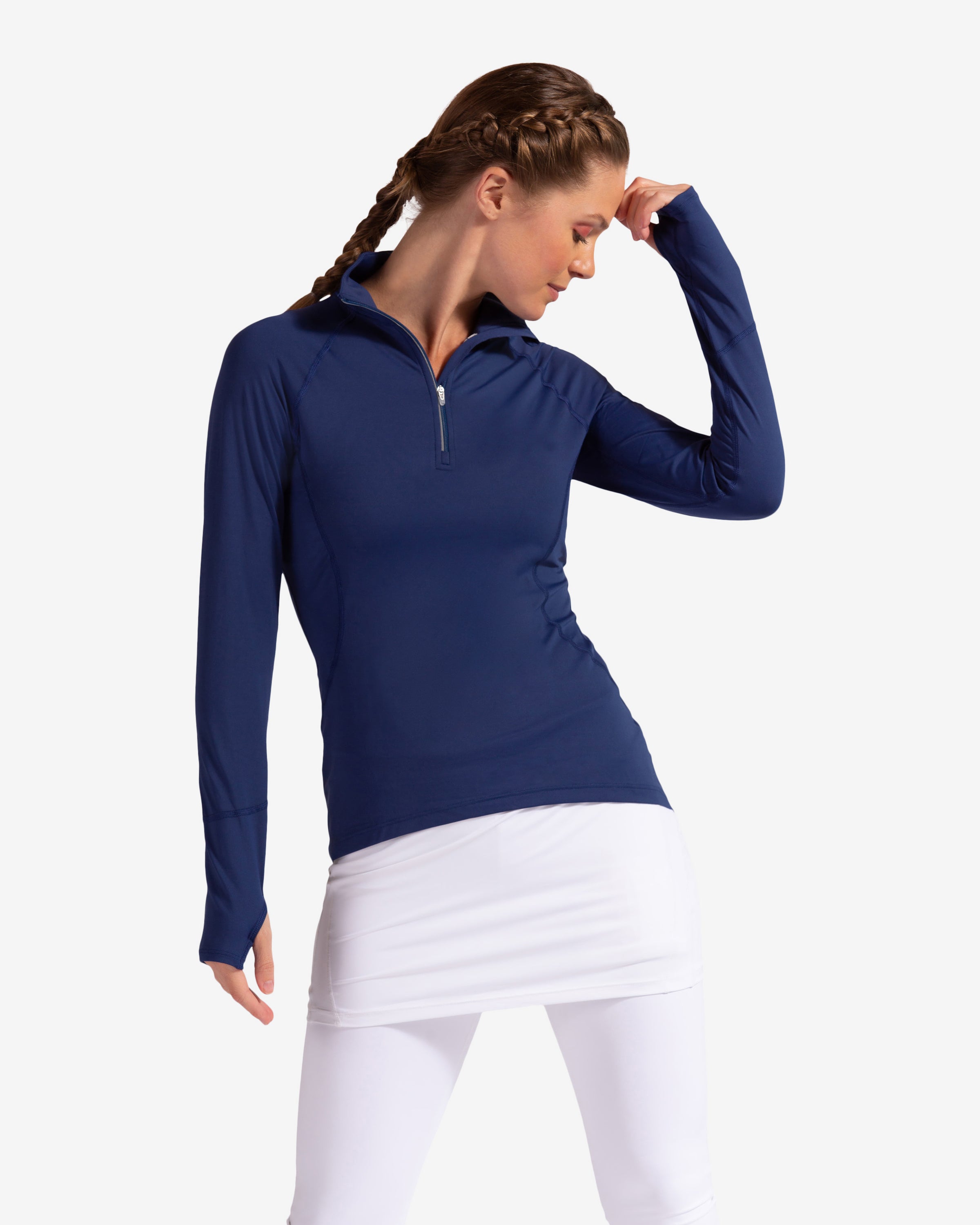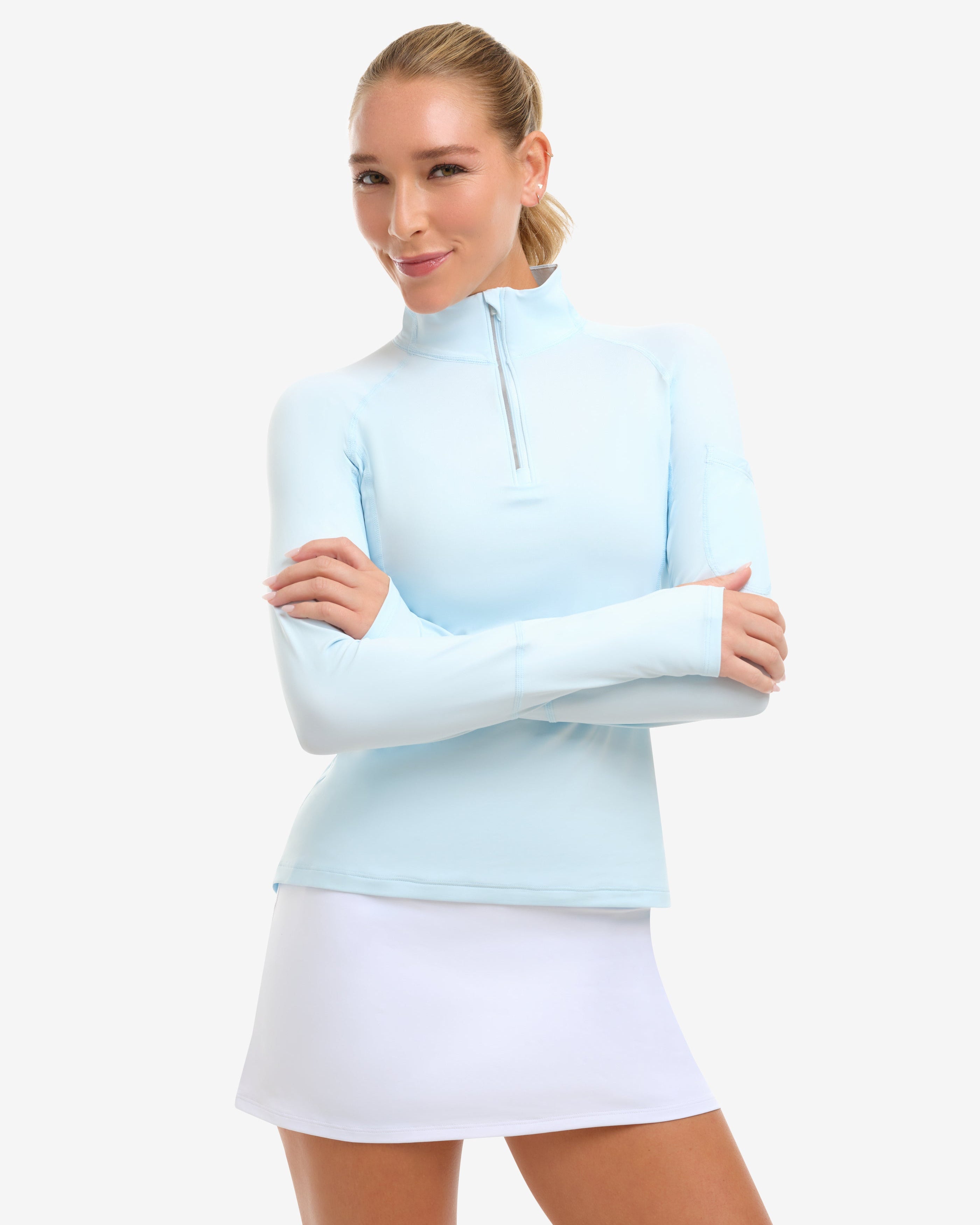 The BloqUV women’s 3/4 zip UPF 50+ top is a best-selling favorite, designed with a high neck and long sleeves for sun protection from neck to hands. This versatile UV shirt can be worn alone or layered over tanks and under jackets. Lightweight, breathable, and perfect for skiing, running, walking, fishing, pickleball, boating, biking, horseback riding, paddle boarding, tennis, and golf.