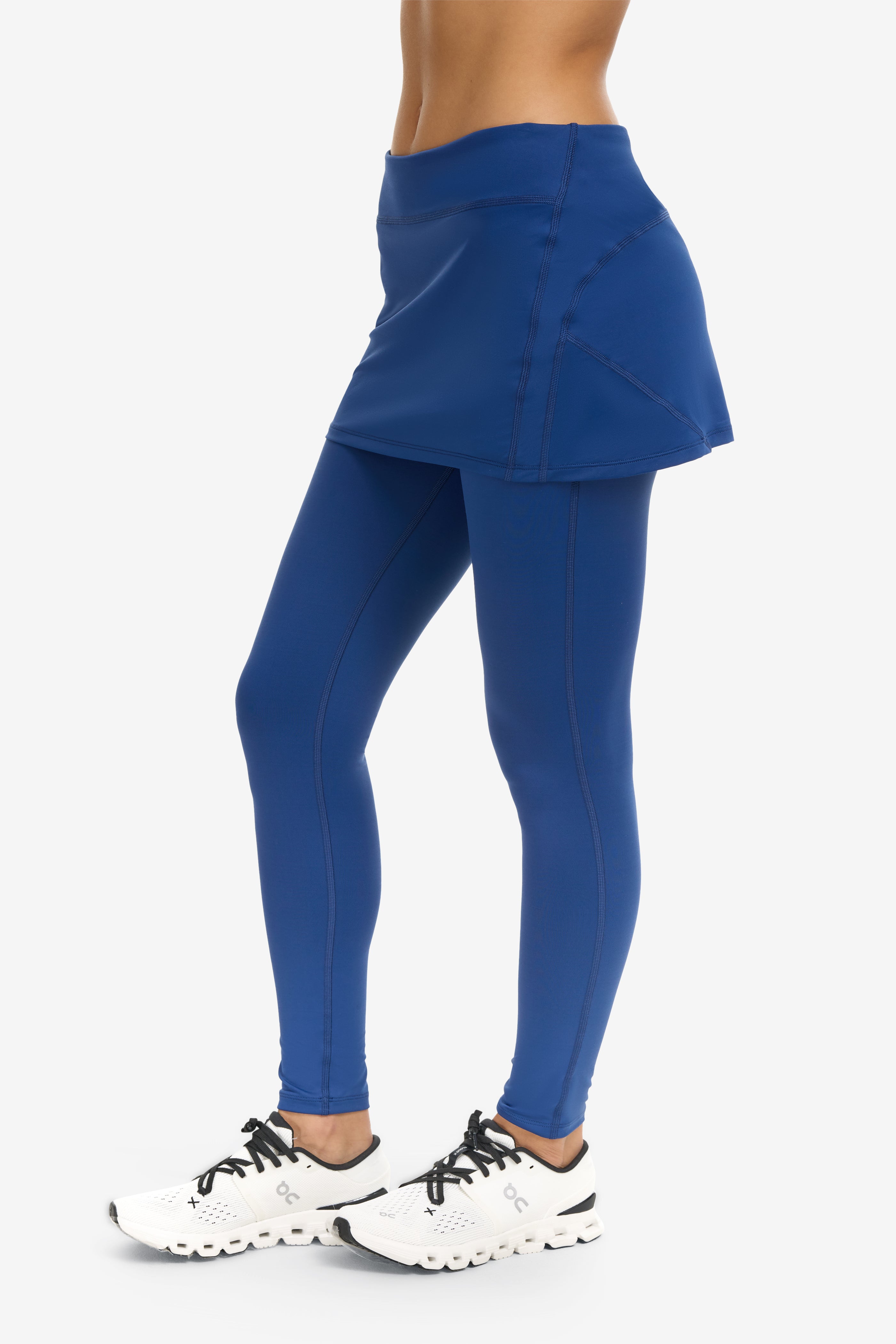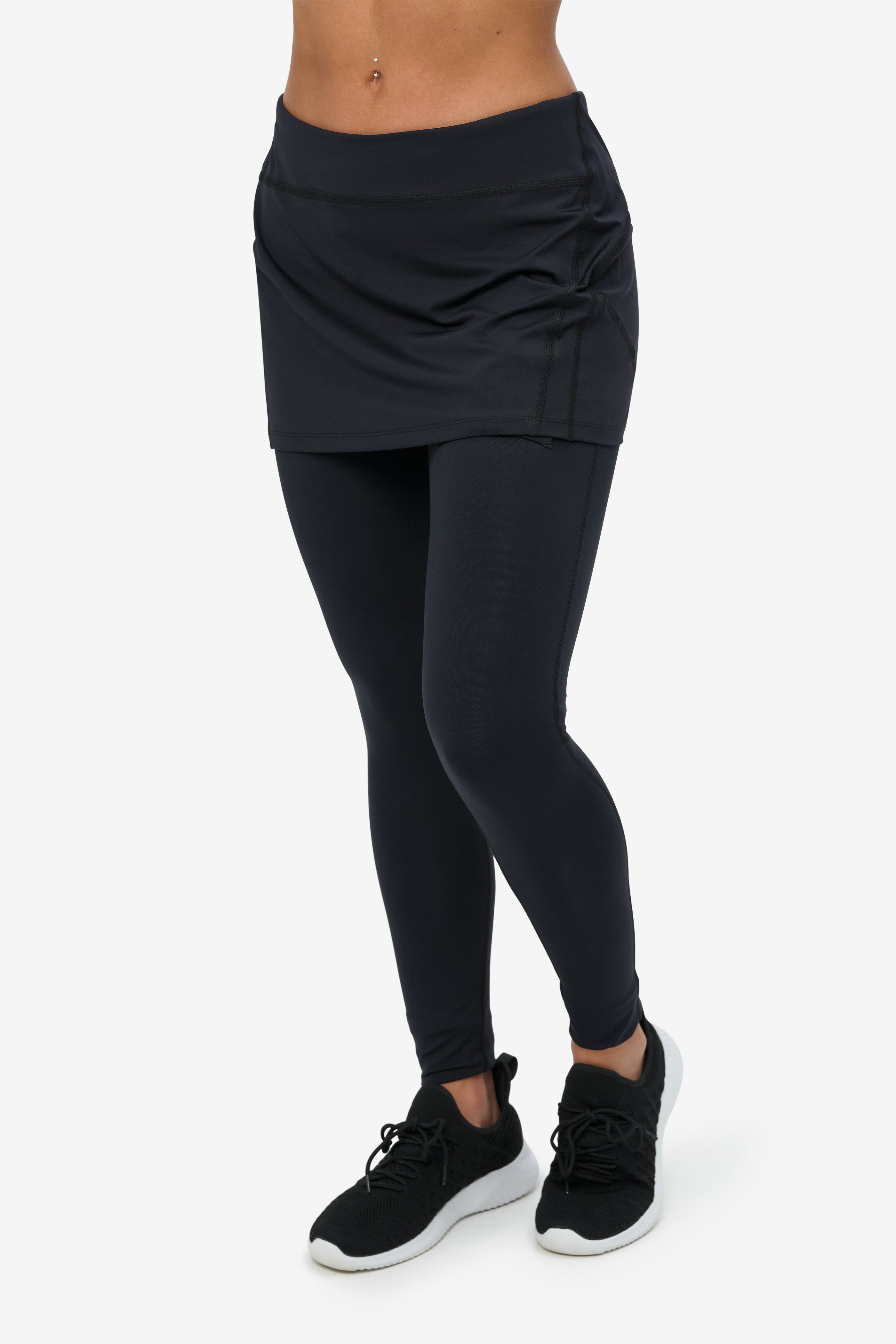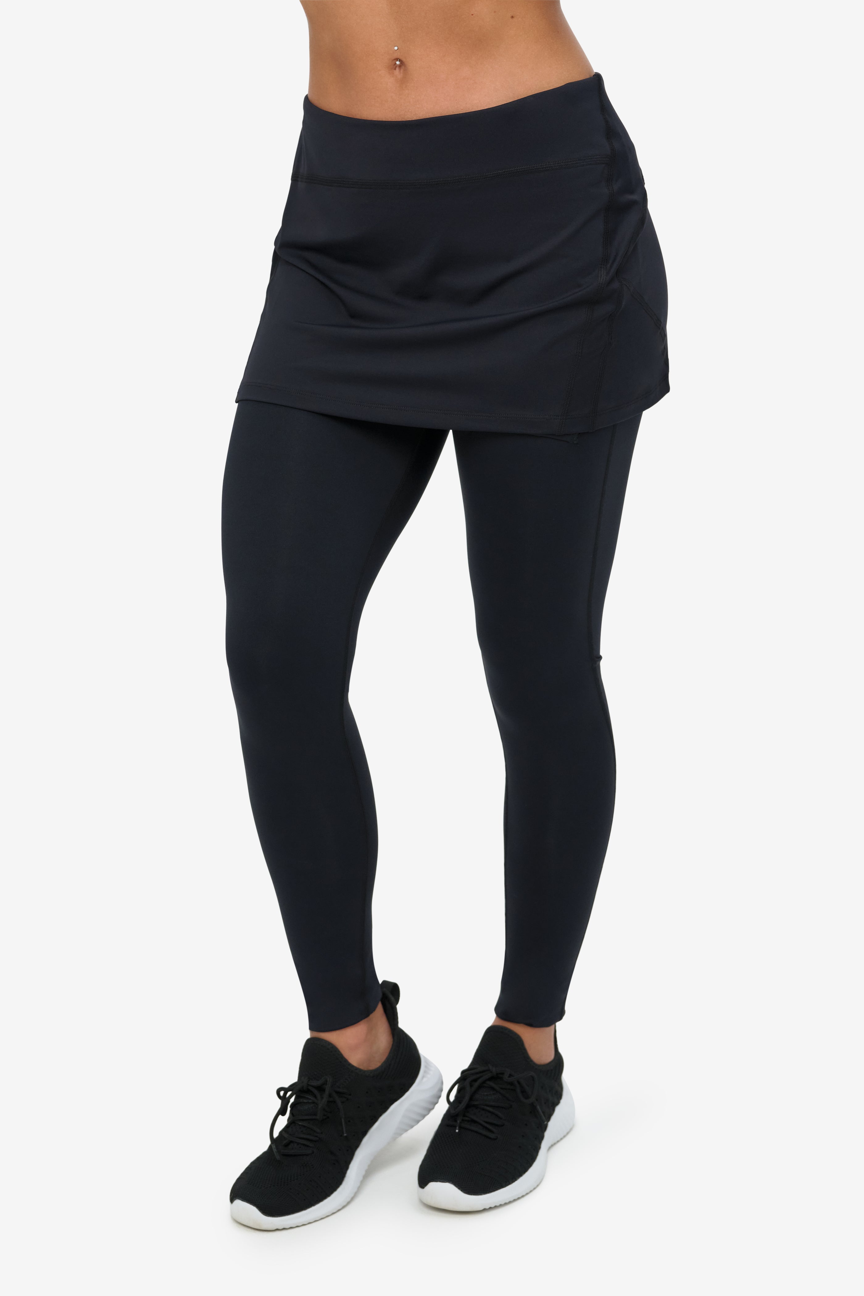 - Full-length leggings with built-in skirt overlay