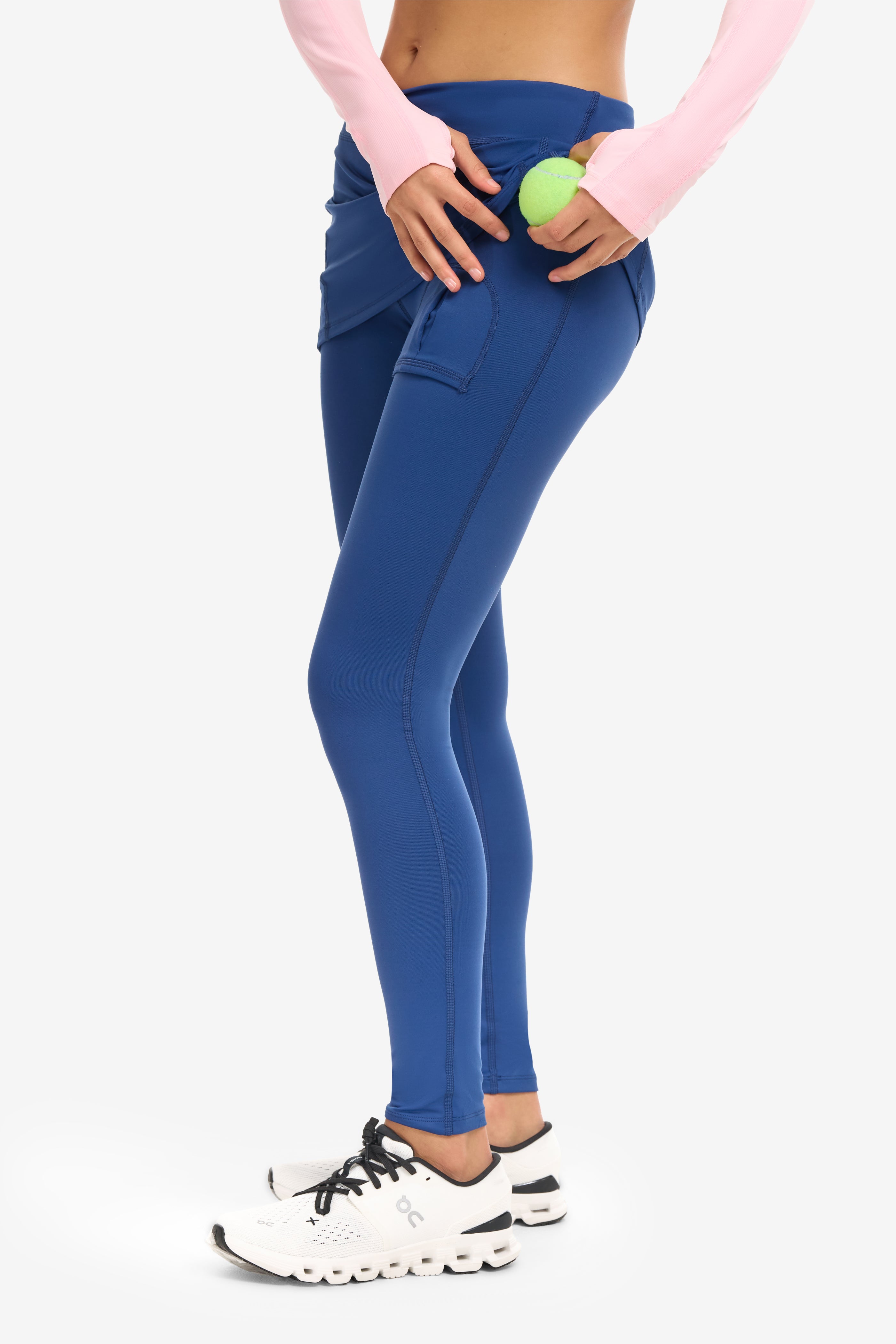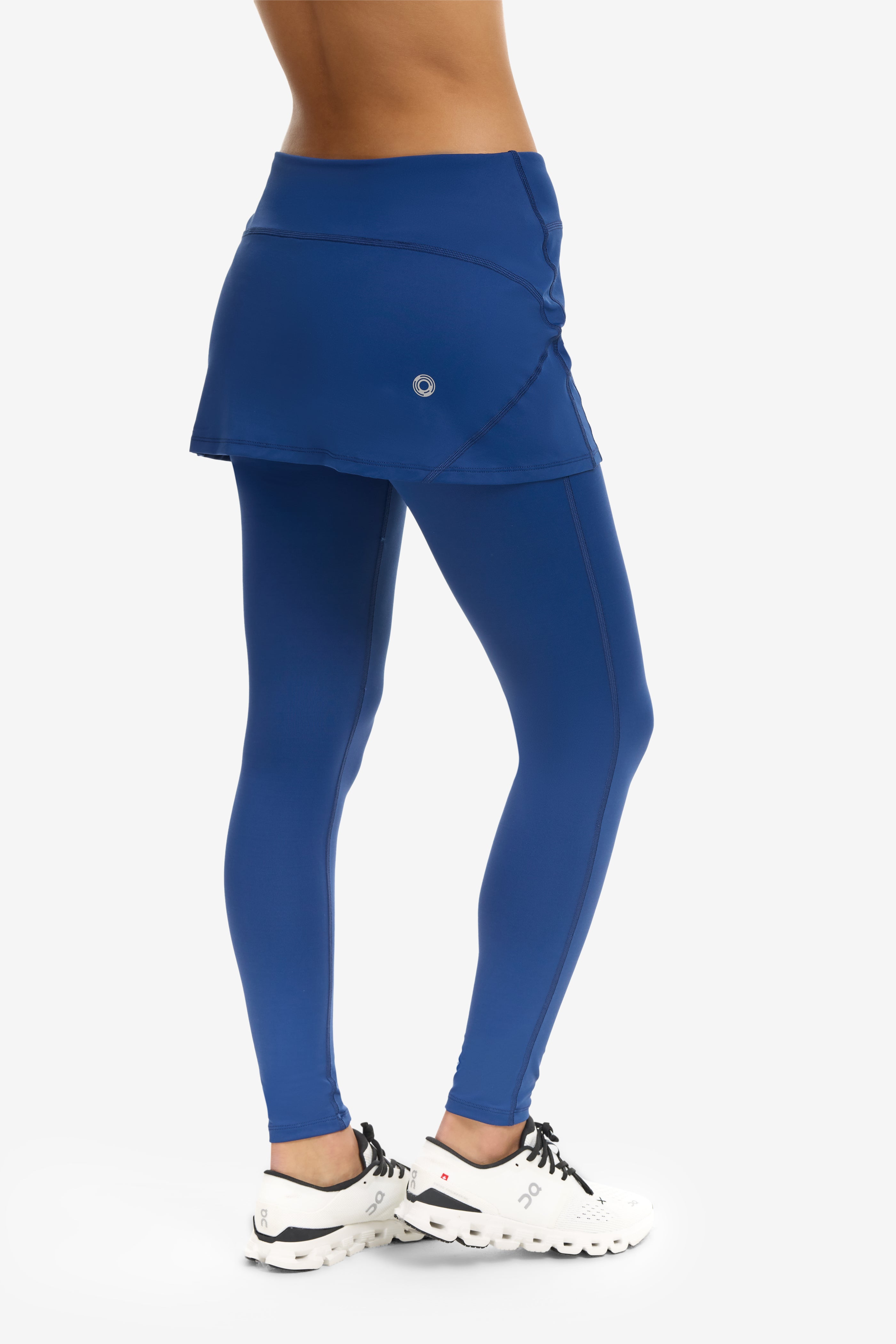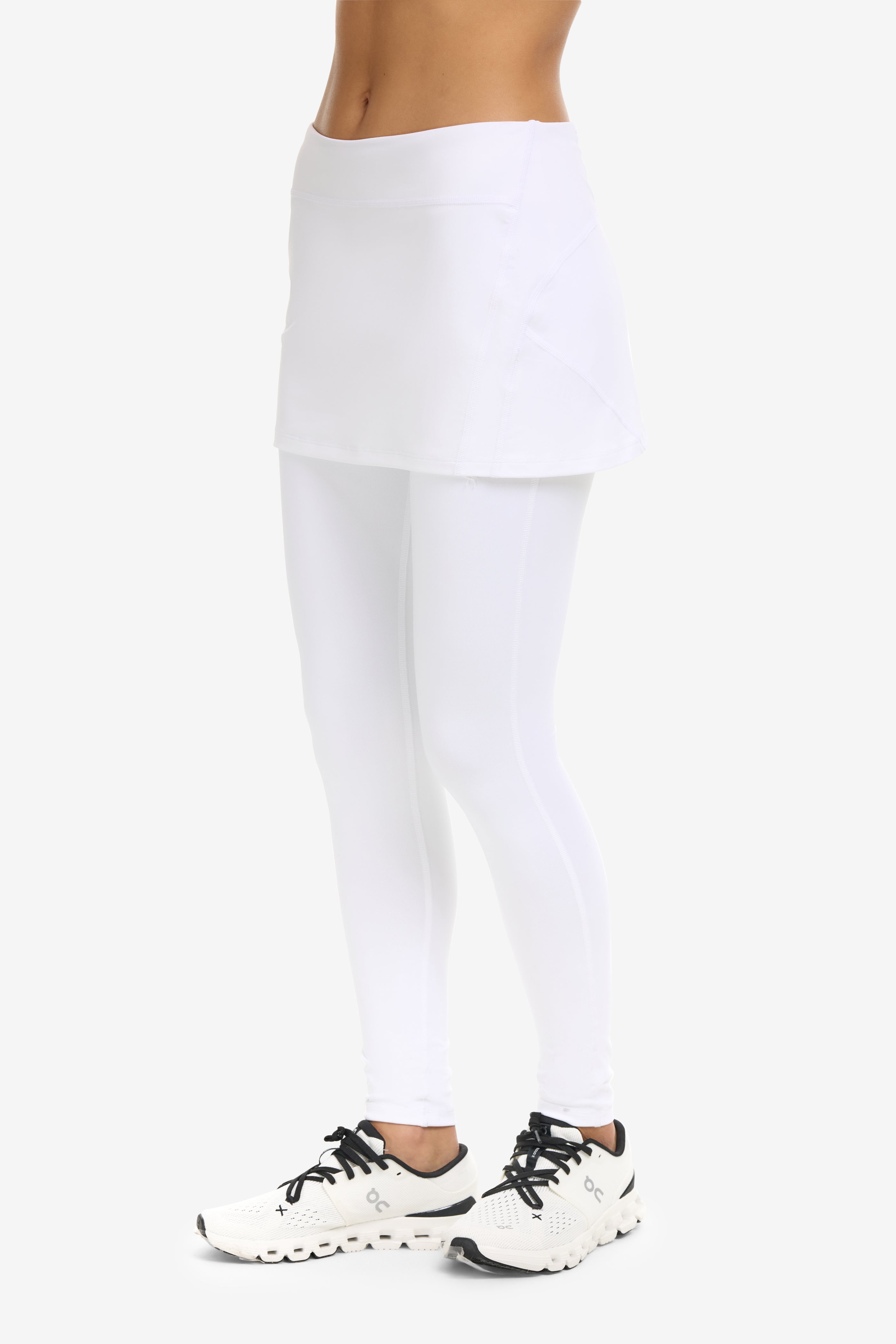 - Full-length leggings with built-in skirt overlay